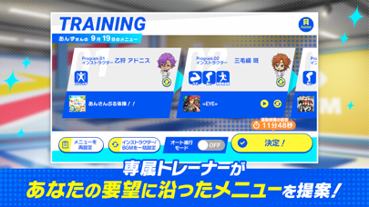 アプリ開始時、乙狩アドニスまたは七種茨を選択できます。10日間のトレーニングを進めていくとほかのキャラが開放。合計51人のインストラクターが、あなたのことをサポートしてくれます。