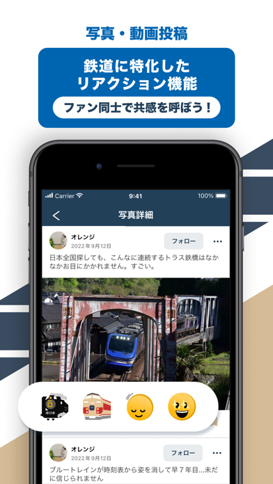 メディアにコメントとハッシュタグを自由につけて投稿。ハッシュタグは、撮影場所や列車の型番などさまざまです。投稿に対するリアクションは、決められた絵文字スタンプのみ。写真や動画に対するネガティブな意見を気にせず、安心して投稿できます。