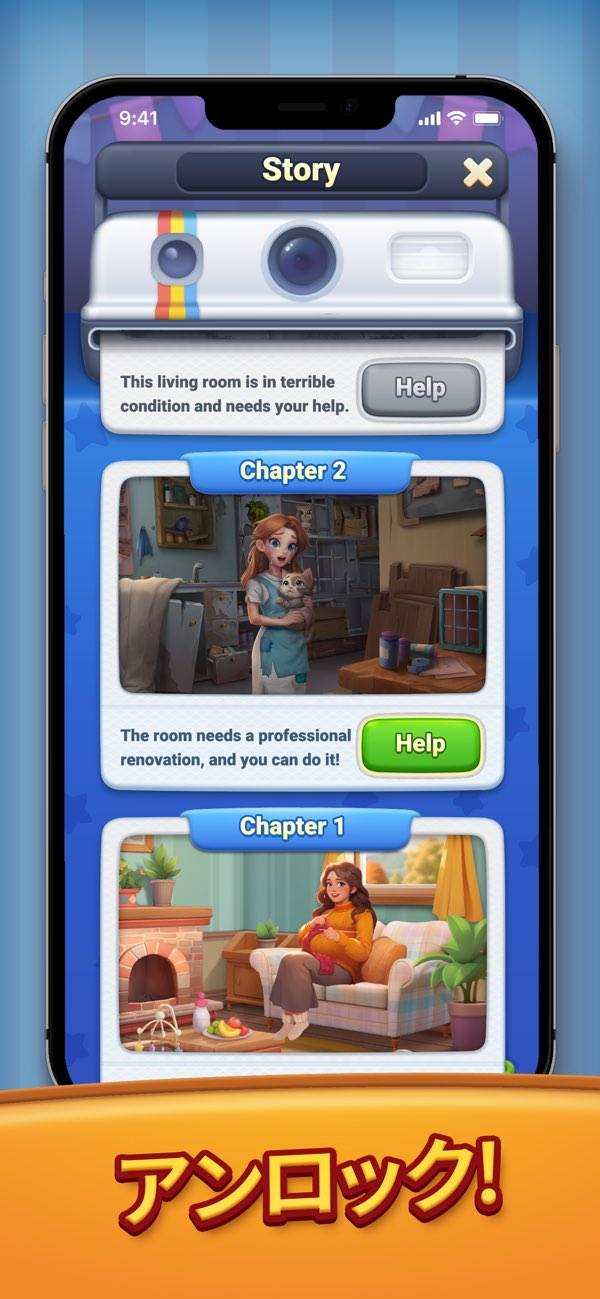 パズルをクリアするともらえる星で、家具などを直しましょう。凍えている親子を助けてあげるストーリーです。一刻も早く、暖かい部屋を提供してあげたくなってしまいますね。