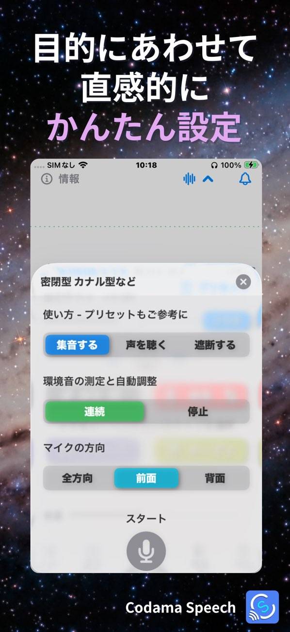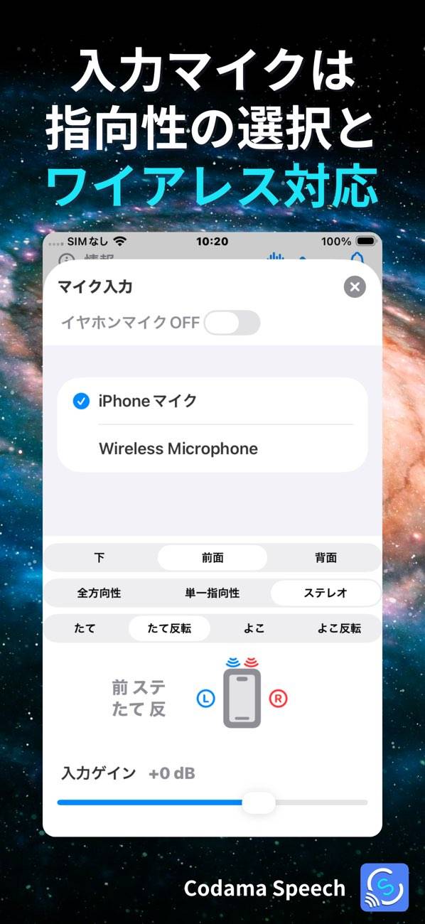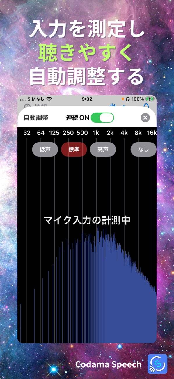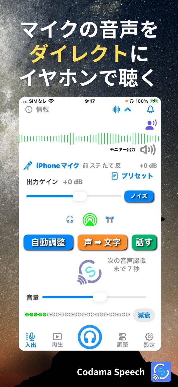 マイクボタンをタップして、音声認識機能を起動します。人の声が聞こえたら画面中央に「S」のアイコンが点滅し、通知でお知らせ。出力ゲインを大きくすると、音を拾いやすくなります。