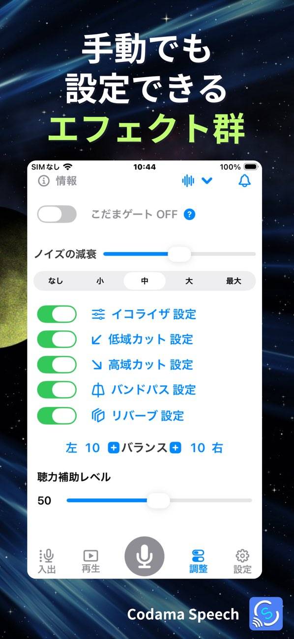 イコライザー、リバーブなどのオン・オフを切り替えて調整が可能。ノイズの減衰なども、なし~最大の5段階から選べます。録音を聞き直して音質が気になった場合、こちらを使用してみましょう。