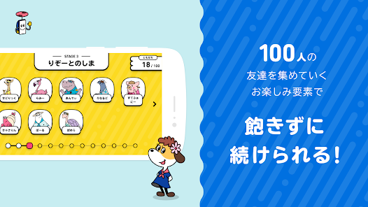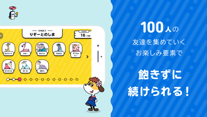 犬のキャラクター「ジャーニー」とともに、英会話を学べるアプリ。相棒のフォンと一緒に冒険することになったジャーニーは、さまざまな動物と出会い、友達を増やしていきます。