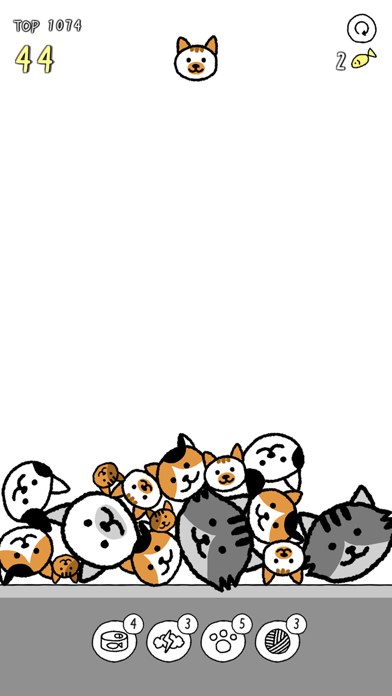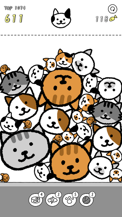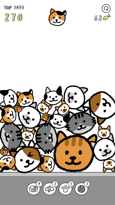 ランダムに出現する猫ブロックを下に落とし、マージさせていきます。4種類のアイテムが使用でき、ランダムに猫ブロックを消したり、全体をかき混ぜたりとさまざまな効果を発揮。ブロックが画面上の天井に到達するとゲームオーバーです。