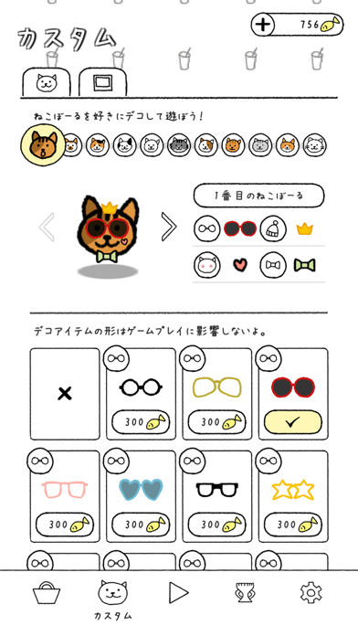 ゲームプレイで集められるイワシを消費して、メガネなどが買えます。猫におしゃれアイテムを追加してカスタム。お気に入りの見た目にすることで、ゲームの雰囲気も変わって飽きずに遊べます。