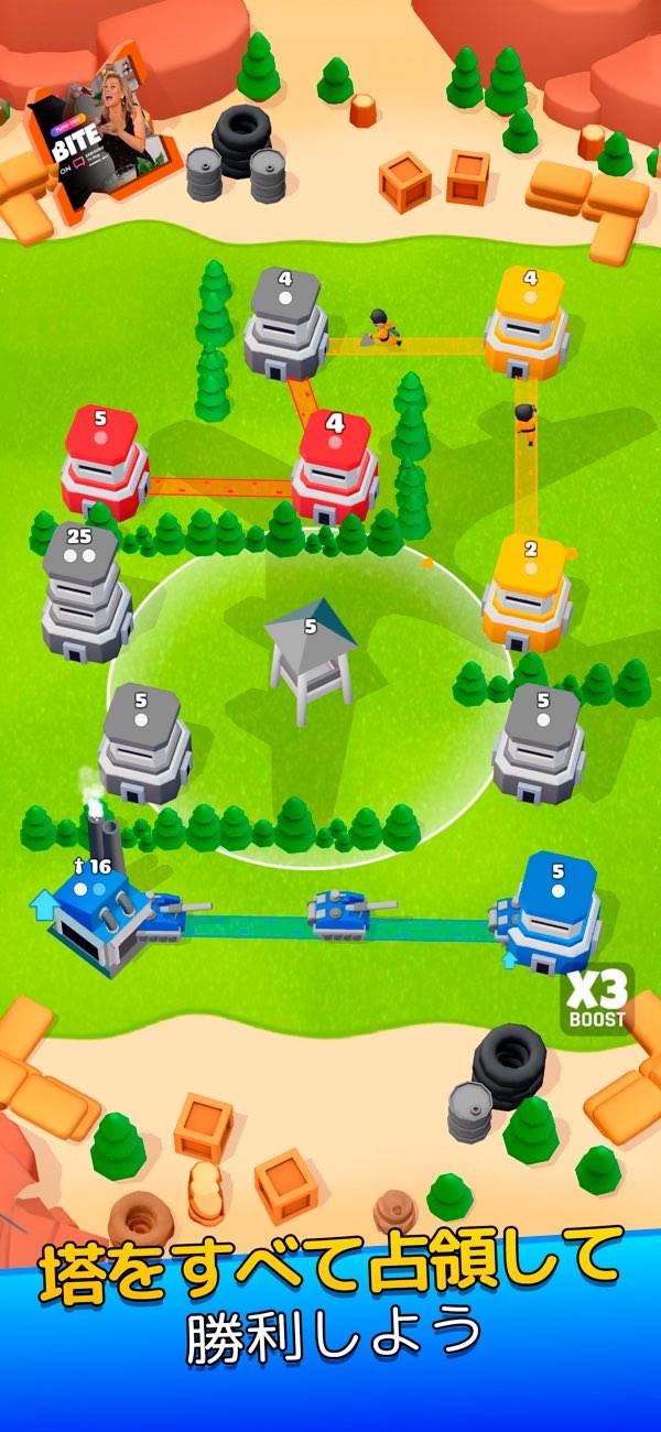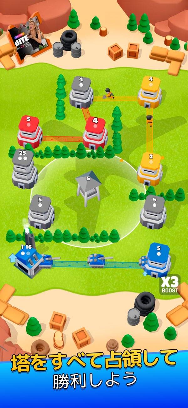 最初は自軍の塔が少ないので、戦力を見極めながら兵士や戦車を進めて自軍の塔を増やしていくという、シンプルながら考えることが多く求められるパズルです。