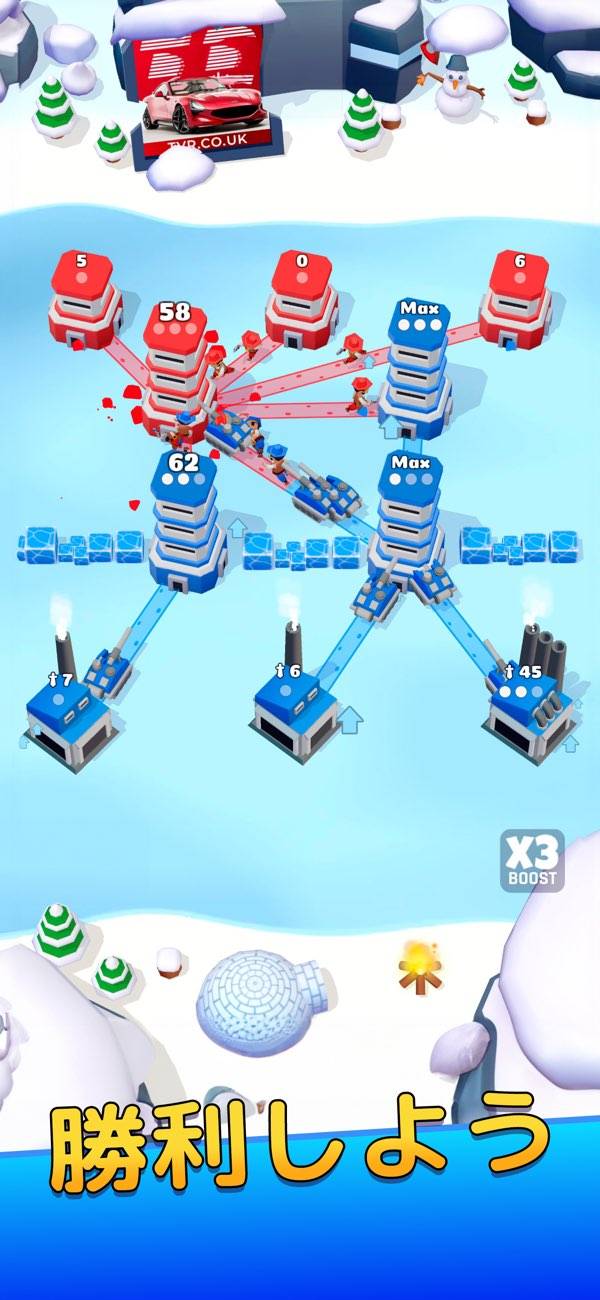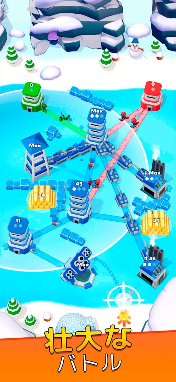 自軍の塔から指定した塔に兵を進ませ、ほかの塔を制圧していく。すべての塔を制圧したらステージクリアです。