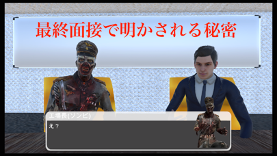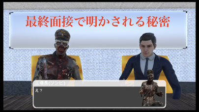 人間の面接官と、ゾンビなのに流暢にしゃべる面接官が出すクイズに答えます。人間の面接官は簡単な問題を出しますが、ゾンビの面接官はゾンビ作品に関する問題を出題。ゾンビマニアな人には簡単かも……?