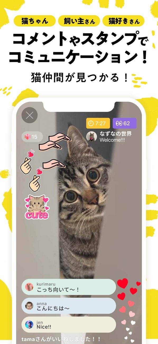 コメントやハートを送る機能も搭載されており、猫の飼い方に関することでも雑談でも、場の空気に合わせて自由な会話を楽しめます。