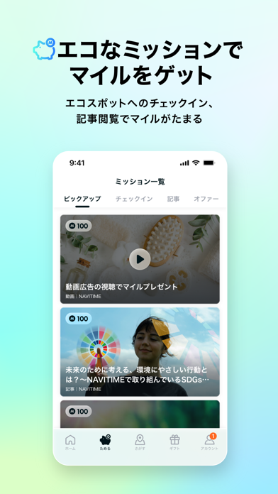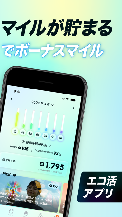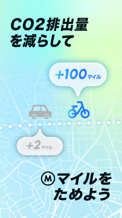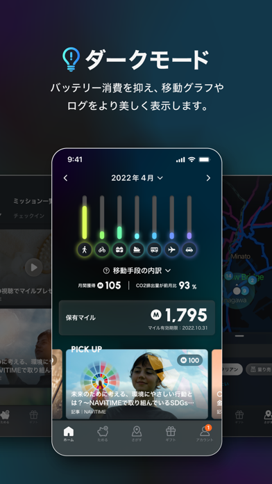 移動やミッションクリアでマイルをためます。移動手段によってマイルのたまり具合は変化。エコな移動手段である徒歩や自転車が付与率が高く、マイルがたまりやすくなっています。