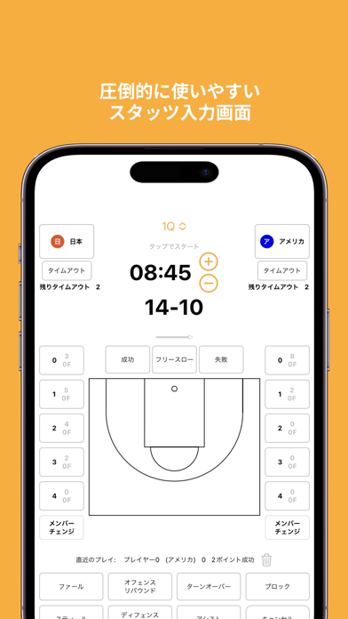 攻防が目まぐるしく変化する中でも、スムーズに記録が行えます。「相手チームの4番がスティールをした」、「自チームの5番が3Pシュートを決めた」といった細かい情報の記録も、タップ操作でらくらく。チームファウルのカウントや、タイムアウトにも対応しています。