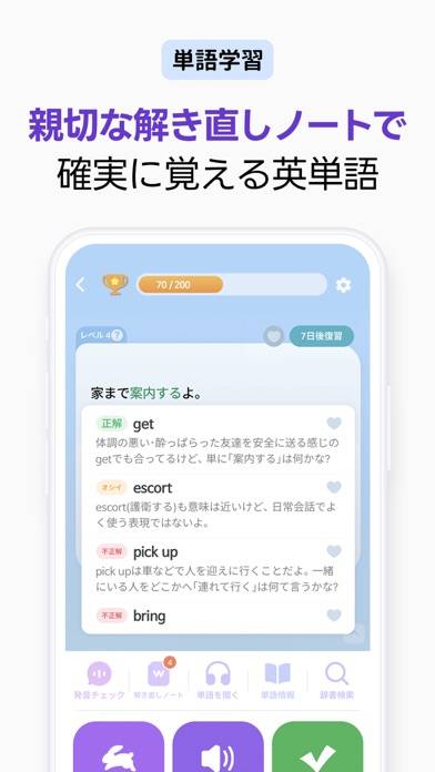 単語学習のほかに、リスニングと文法など、より実践的な学習も用意されています。単語学習と比較すると、学習の難易度は上がりますが、楽しく効率的に学習できるのが魅力。英語を独学で習得するなら挑戦する価値はあります。