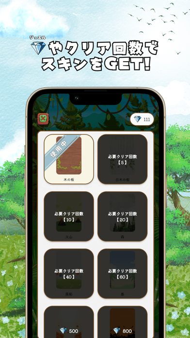 ステージクリア回数に応じて、ゲーム中に利用できる背景が手に入ります。森や火山、キャンプに海中などさまざまな背景があり、切り替えると気分転換になって楽しめるでしょう。