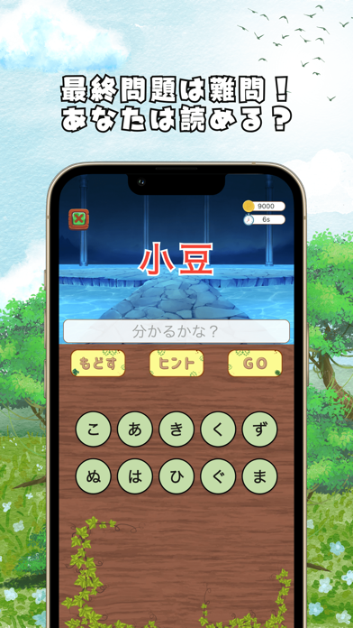 出現した漢字の読み方を入力し、「GO」をタップして解答。入力は専用のひらがなボタンを使用していきます。読み方がわからないときはヒントをチェックすることも可能です。