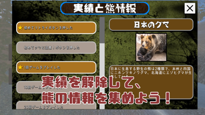 実績を解除すると熊情報が見られる、ちょっとしたおまけ要素もあり。日本に生息している熊はどんな種類かなど、熊に関する知識をチェックできます。雑学が好きな人は覗いてみてください。