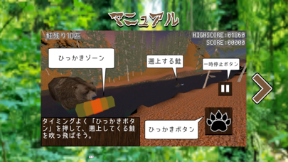肉球マークをタップするとヒグマが腕を振ります。タップ→腕を振るまでちょっとラグがあるので、鮭が腕の当たり範囲に重なった瞬間にタップするのは遅いです。川の真ん中あたりに鮭が来たタイミングがちょうどいいでしょう。