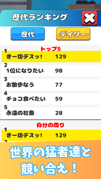 進んだ距離がそのままスコアになります。ゲームオーバーになった地点からさらにスコアを伸ばしたいときは、広告を見ると再開が可能。スコアを伸ばしてランキング上位を目指してみませんか?