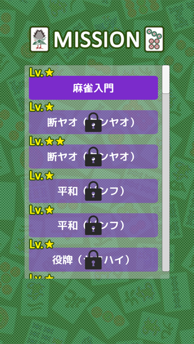 これから麻雀を始める人向けの麻雀練習アプリです。ミッション方式で、立直(リーチ)や断ヤオといった組みやすい役から順番に覚えていきます。各役ごとに複数のミッションが設けられており、自然と反復練習ができる仕様になっているのが特徴。