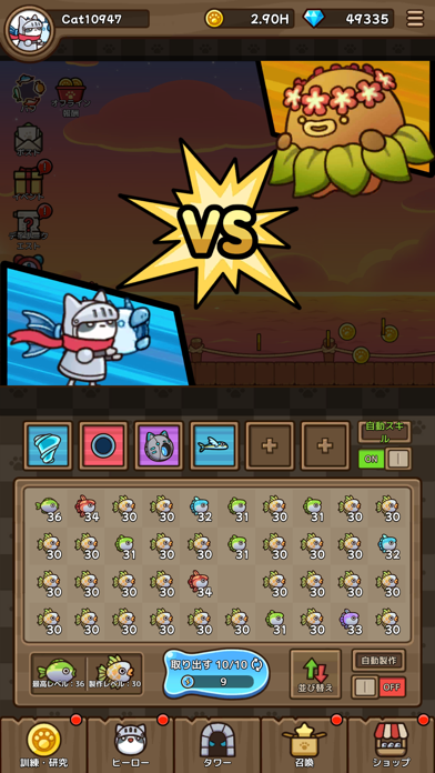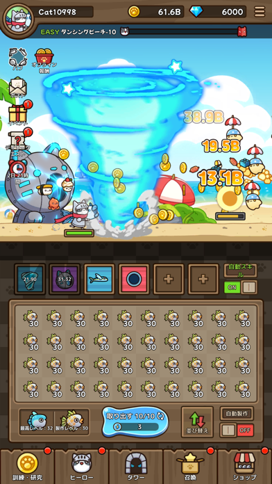 数字の書かれた魚をスワイプでマージして、武器を強化。一番大きい数の魚が、猫の勇者の武器の強さになります。「取り出す」をタップして魚をどんどん出し、マージさせましょう。マージは自動化することも可能です。
