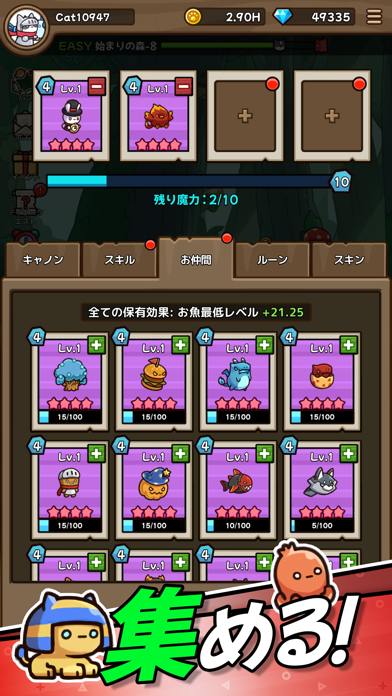 ステージ進行で、お仲間を最大6体まで連れていけるようになります。お仲間はオート攻撃をしてくれるので戦闘が有利に。ガチャで手に入るので、レアお仲間を狙って引いてみてください。