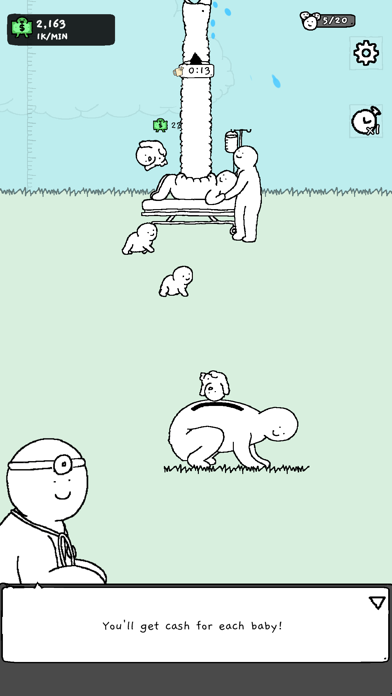水や食べ物、お金を与えることでガチョウを成長させていくゲームです。お金は放置でも貯まっていくのが特徴。「育つ」ボタンをタップすることで、ガチョウが空高く伸びていきます。ガチョウはある程度成長すると枝分かれしてより多くのお金が集められるようになります。