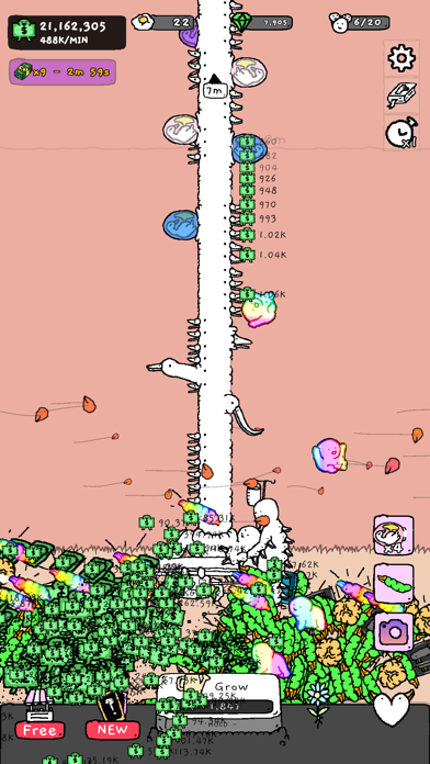 空高く伸びるガチョウが成長すると、枝(新たなガチョウ)が生えてきます。枝にはお金を自動で集める効果があり、配置次第でたくさんのお金を自動的に集められるようになります。想像力をフルに発揮して効率的な配置を見つけてみてはいかがでしょうか。