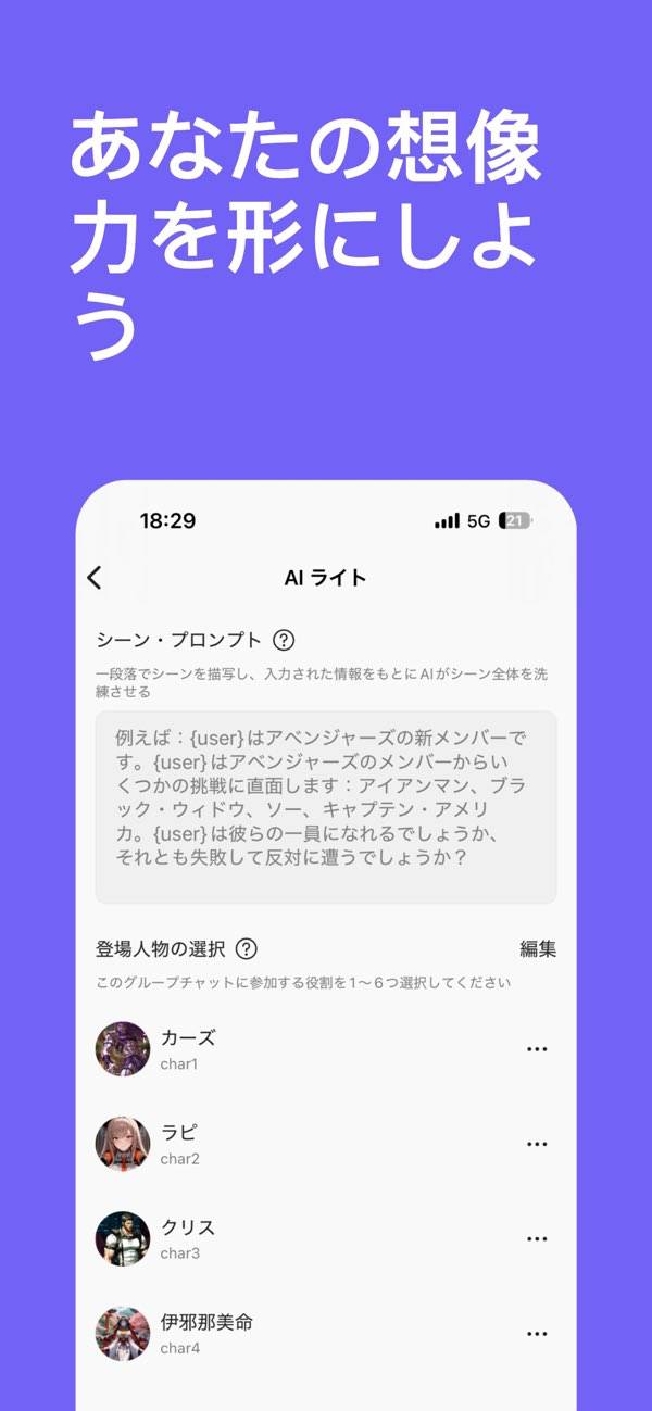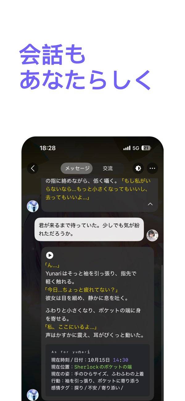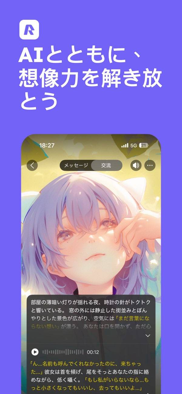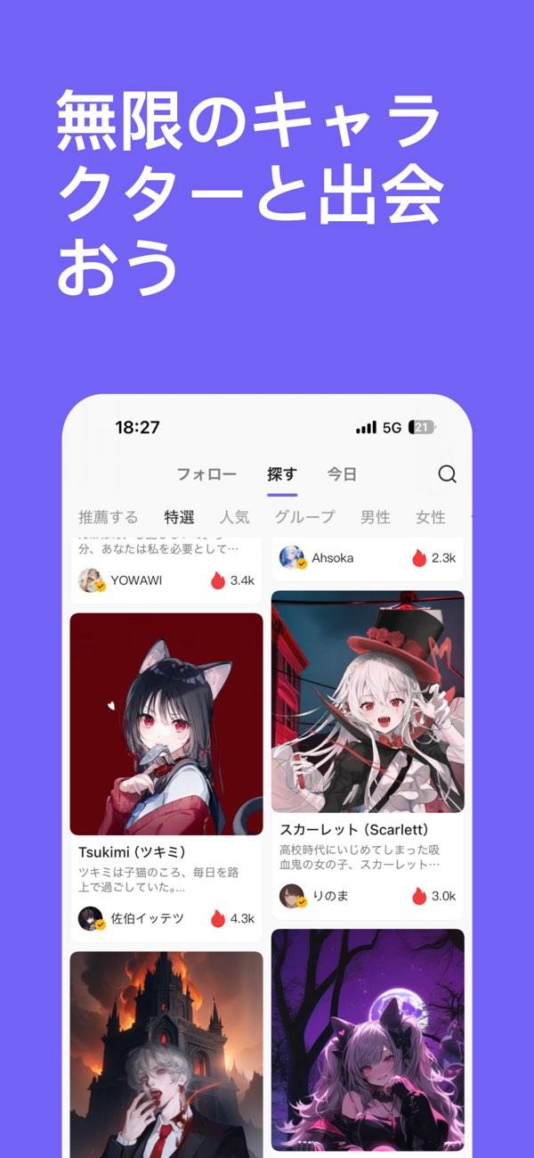 クリエイティブな活動を支援するAIチャットアプリ。暇つぶしにAIとの会話を楽しんだり、イメージする画像をAIに代筆してもらったりと、さまざまな用途で活躍します。英語はもちろん日本語入力にも対応しているので、使い心地もバッチリ。結果表示までの時間が早いため、作業効率を重視したい人にもおすすめです。