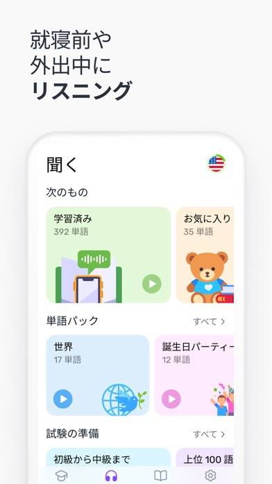 4択問題や文字の並べかえといった形式で単語を覚えられます。意味はもちろんスペリングもしっかりとカバーしてくれるのが嬉しいところ。出題時には単語の読み上げがされるため、発音も同時に学べるでしょう。