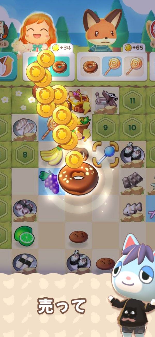 果物、野菜、お菓子などをマージさせて、動物たちの欲しがるものを作ります。欲しがっているものができたら「販売」をタップして完了。動物たちのお願いを聞いていくと、キャンプ場の施設が充実していきます。