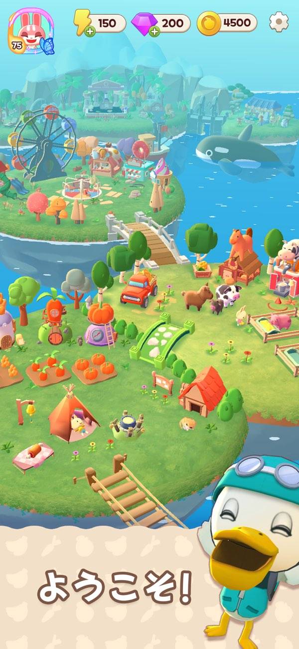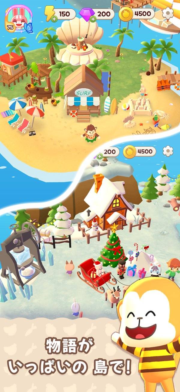 何もない島を、動物たちのキャンプ場にしていく、マージパズルゲーム。いちご+いちご=ブルーベリーといったように、同じ果物・野菜のピースをマージさせると別の果物・野菜に変わっていきます。動物がどれをほしがっているか確認しながら、マージさせていってください。