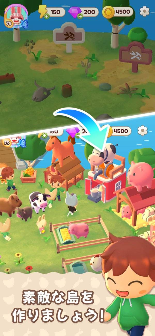 荒れ果てた島に建物を増やし、自分だけのキャンプ場を作っていきましょう。建物を増やすと、建設に使うお金などが時間経過で手に入るようになります。どんどん島がにぎやかになっていく様子が楽しめるでしょう。