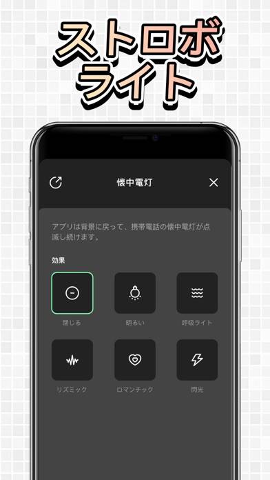 多彩な点滅パターンを搭載した懐中電灯としても使えます。イラスト&テキストのシンプルな表示で、機能がわかりやすいのが特徴。点滅の種類が多いので、イベント時の照明演出としても利用できそうです。