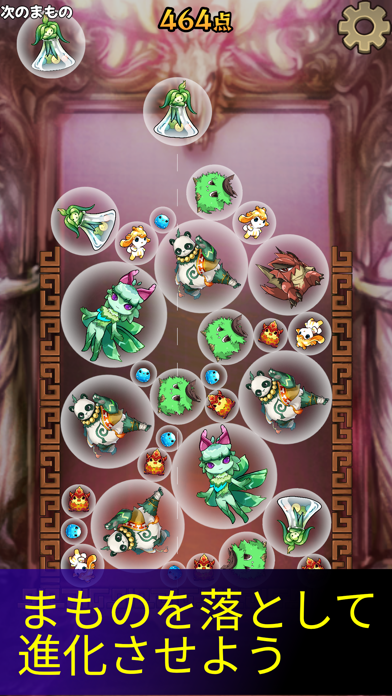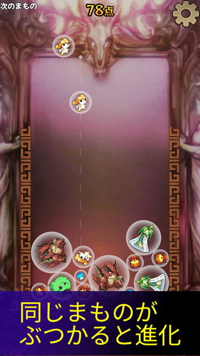 バブルに入ったまものを落とし、同じまものをマージさせていくパズル。画面にある仕切りからまものがはみ出てしまうとゲームオーバーになります。マージするたびに大きくなり、さまざまな進化を遂げていくまもの。あなたはどこまで進化させてあげられるでしょうか。