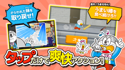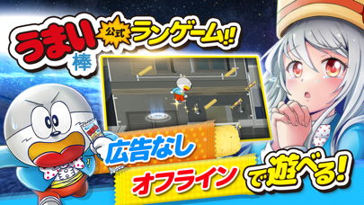 ステージにあるうまい棒やコインを取っていく、横スクロールアクションゲーム。お菓子「うまい棒」でお馴染みのキャラ、うまえもんが住宅の屋根やビルの壁を登っていくという、なかなかアクロバティックなゲームです。
