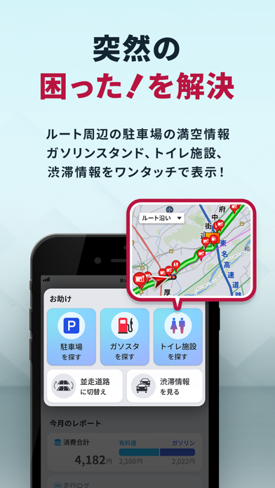 トイレ、駐車場(満空情報付き)、ガソリンスタンドなどをワンタップで検索できます。「トイレの場所がわからない」「駐車場が満車で困った」という状況を回避。Android Auto/Apple Carplayを利用すれば、音声でも検索できるため運転中でも安心です。