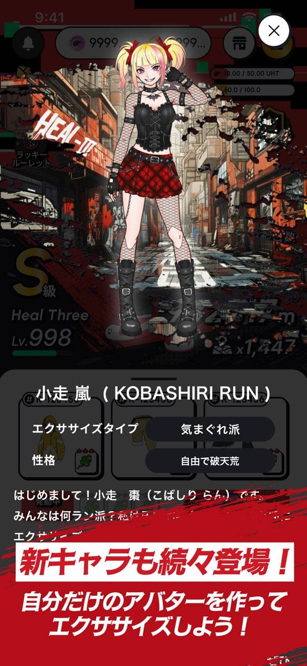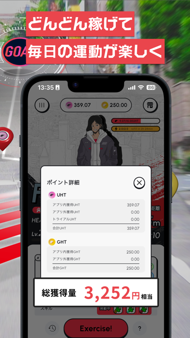 移動で暗号資産のUHTが貯まるヘルスケアゲームです。広い意味では移動系のポイ活アプリの一種とも言えますが、それらに比べゲーム性が強い点が特徴的。アバターを作り、特殊効果のあるクローズ(アイテム)を装備させ、トークンハンティングに挑みます。