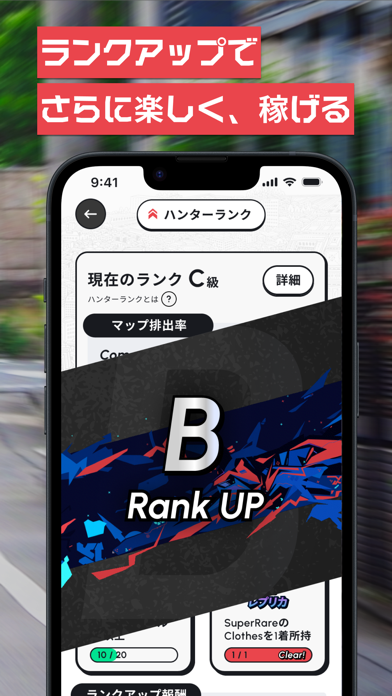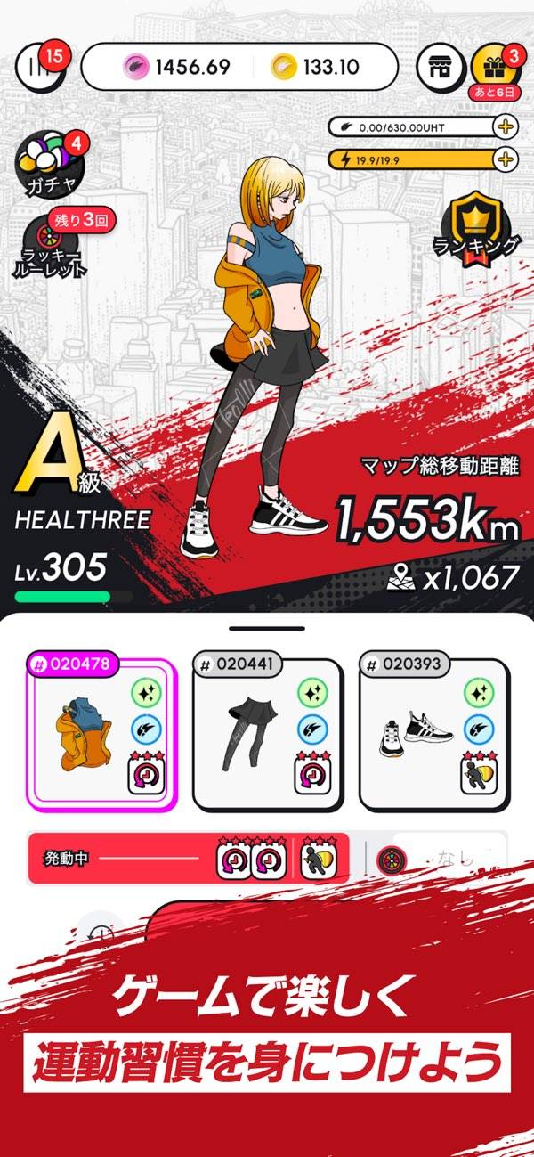 RPG的なゲーム要素も特徴の一つ。移動を続けてプレイヤーレベルを上げ、クローズ(装備)を身につけることで、最終的にUHTの獲得効率が上がります。クローズは課金で手っ取り早く入手するほか、無課金でも少しずつグレードアップできるようになっています。