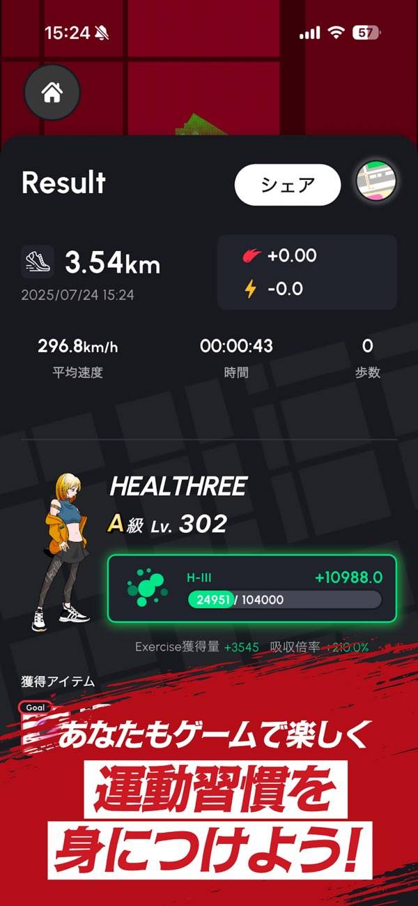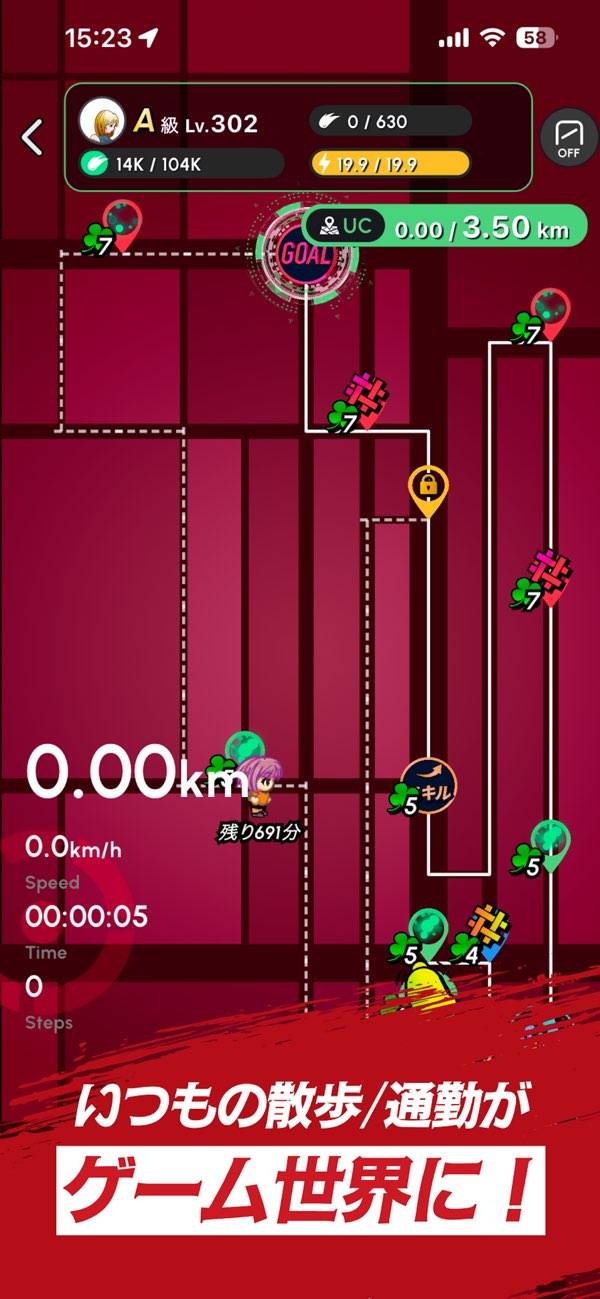 アプリ内でエクササイズを開始すると、仮想マップが展開されます。仮想マップ上は曲がりくねっていても、実際の移動では好きな道のりでOK。目標はゴールですが、ゴール前にも報酬の獲得チャンスであるスポットが多数存在。いつもの移動に、冒険的な楽しみが加わります。