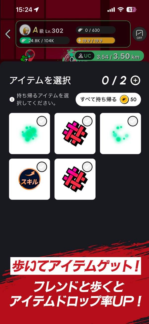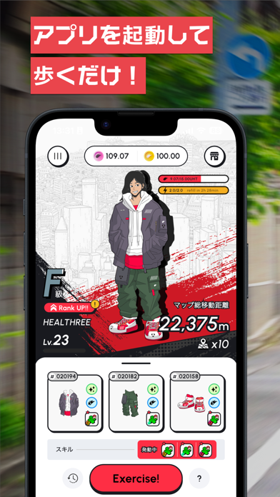 RPG的なゲーム要素も特徴の一つ。移動を続けてプレイヤーレベルを上げ、クローズ(装備)を身につけることで、最終的にUHTの獲得効率が上がります。クローズは課金で手っ取り早く入手するほか、無課金でも少しずつグレードアップできるようになっています。