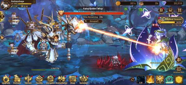 攻撃力、HP、コールをレベルアップさせて要塞を強化。世界樹の種コールをレベルアップさせると基本戦闘力があがります。1レベルずつではなく、5~100レベルずつ一気にレベルアップできるのでスムーズです。