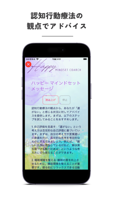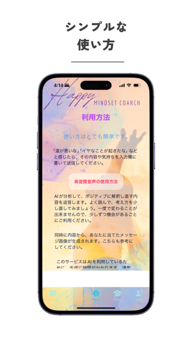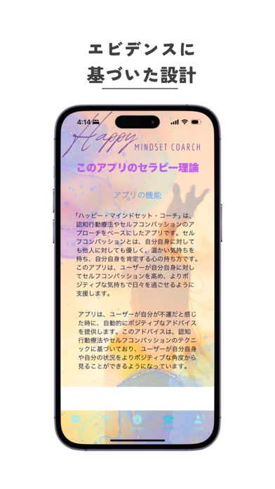 「ハッピー・マインドセット・コーチ」は、元々は友人や家族のために作ったアプリで、悩みや不満をいかに良く解釈して、気分を楽に出来るかという点にこだわりました。