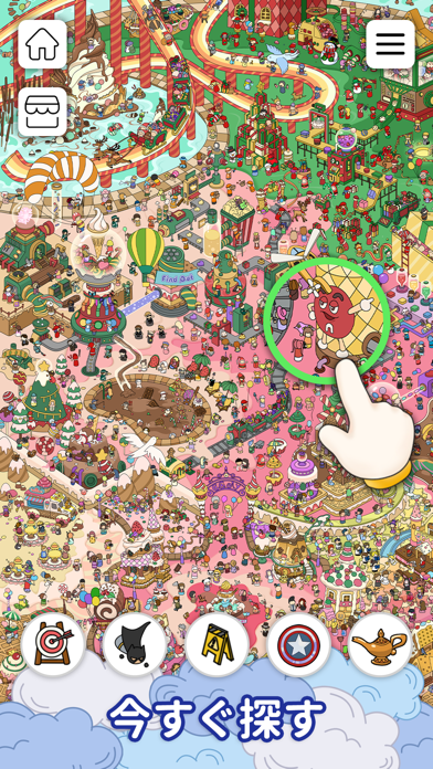 細かい絵の中に隠された動物やアイテムを見つけていく、探し物ゲーム。犬、ワニ、ダルマ、本など隠されているものはさまざまです。序盤は木の上など目立つところにあって簡単に見つけられますが、後半になってくると物陰など見づらいところにあり難易度アップ。つい夢中になって探してしまいます。