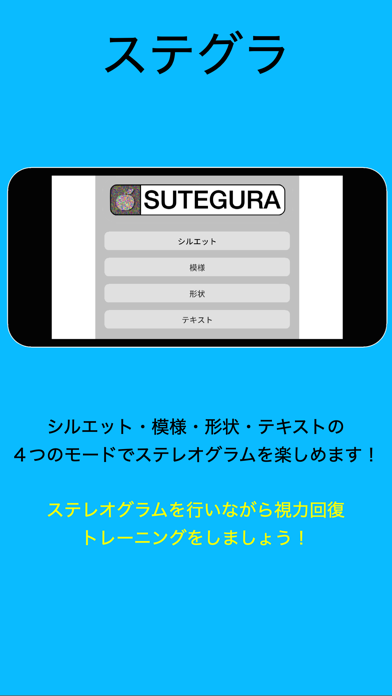 シルエット・模様・形状・テキストの4つのカテゴリーの立体視が用意されています。初めはシルエットがおすすめ。動物やモノなどが隠されているカテゴリーで、隠された絵を比較的見つけやすくなっています。