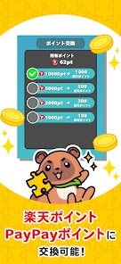 5,000以上ものジグソーパズルで、楽天ポイント、PayPayポイントが稼げるアプリです。絵画や風景、動物など多彩なパズルがあり、完成させるとゲーム内ポイントを獲得。ためていくと100~1,000円分の楽天・PayPayポイントと交換できます。