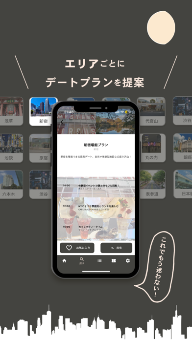 東京都内のおすすめデートスポットが検索できるアプリ。新宿、渋谷などのエリア別のほか、居酒屋やカフェなどのカテゴリーで検索もできます。