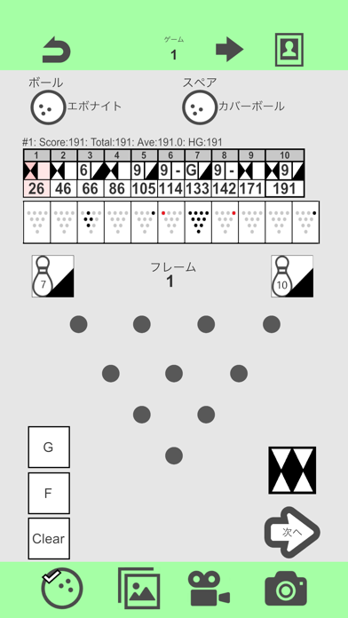 画面中央のピンをタップしてスコアを記録。黒い丸が倒れたピン、白い二重丸が倒れていないピンです。1投球目を入力し「次へ」をタップすると、2投球目に移れます。1ゲーム分を入力した後、2ゲーム目を入力することも可能です。
