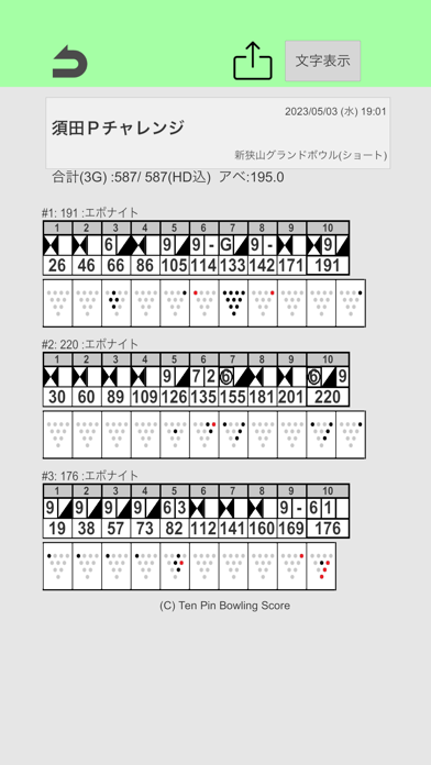 2ゲーム分のスコアを入力すると、分析機能が開放されます。データをもとに自己ベスト(ハイゲーム)や、マーク率、スプリット率を分析。プロのアベレージは200超えしているので、上手くなりたい人は150~180を目指したいですね。