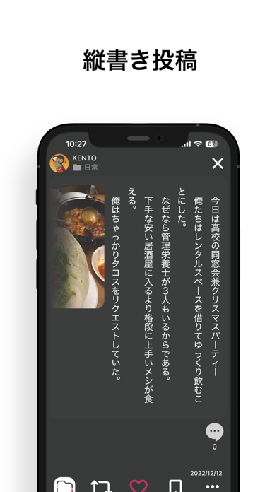 フォルダごとに多彩なジャンル・媒体を投稿できます。画像、イラスト、文章、音楽などさまざま。文章は縦書きに対応しており、画像もともに添付できる親切仕様です。自分の創作物をいろんな人に見てもらえるでしょう。