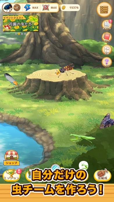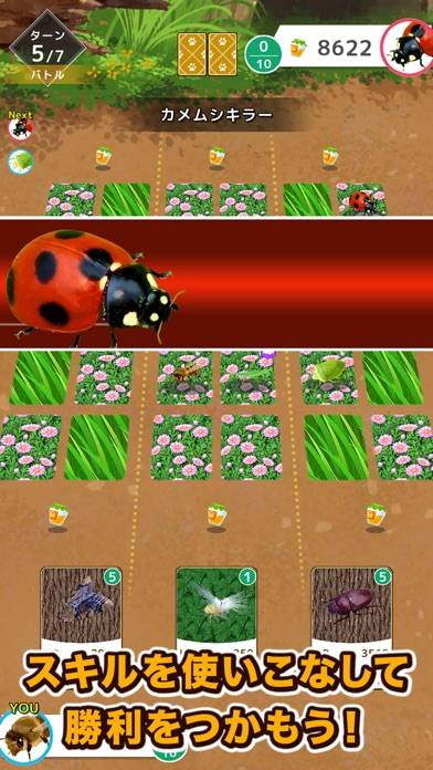 虫のカードを編成して戦う、戦略シミュレーションゲームです。幼虫から蝶、カブトムシやカマキリなど幅広い虫が登場。場に虫を召喚してはちみつを奪い合う、トレーディングカードゲームのようなルールが楽しめます。