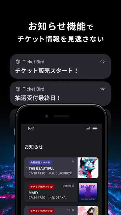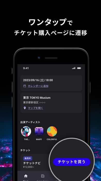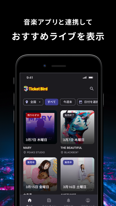 邦楽・洋楽問わず、音楽アーティストたちの国内のライブ情報が見られます。好きなアーティストたちをフォローし、ライブ情報をチェック。購入可能なチケットがある場合は、アプリからチケット販売サイトへ移動できます。