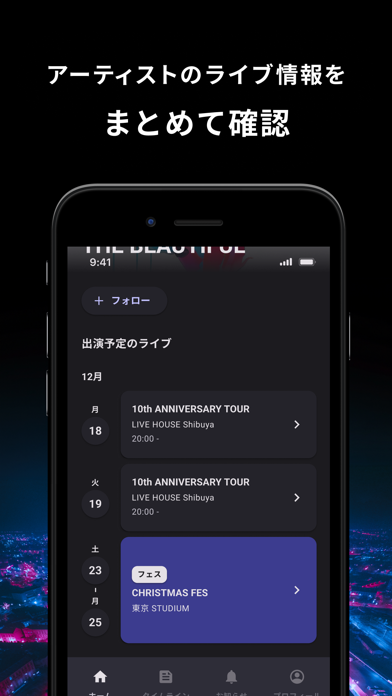 - おすすめorフォロー中のアーティストのライブ情報をチェックできる